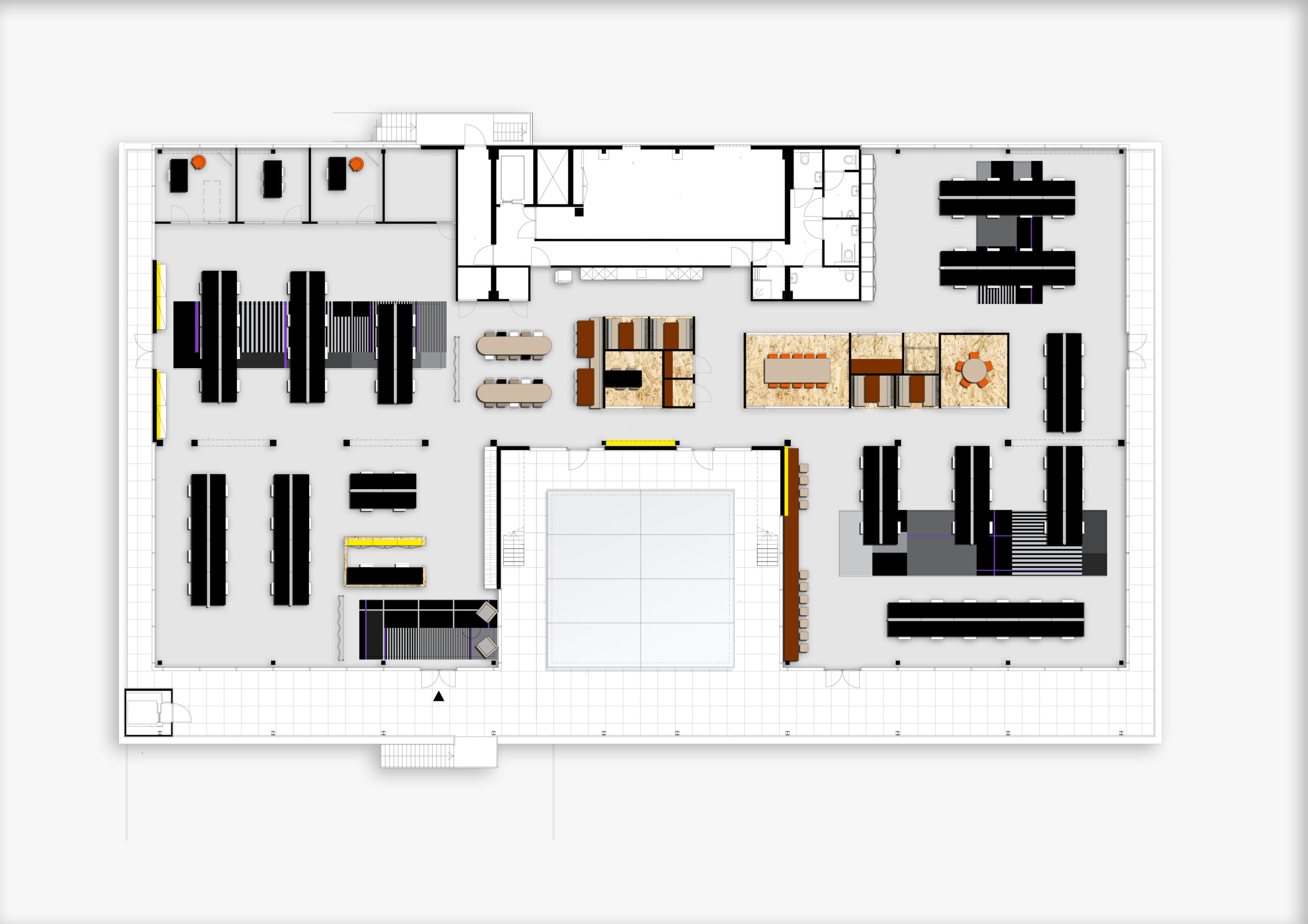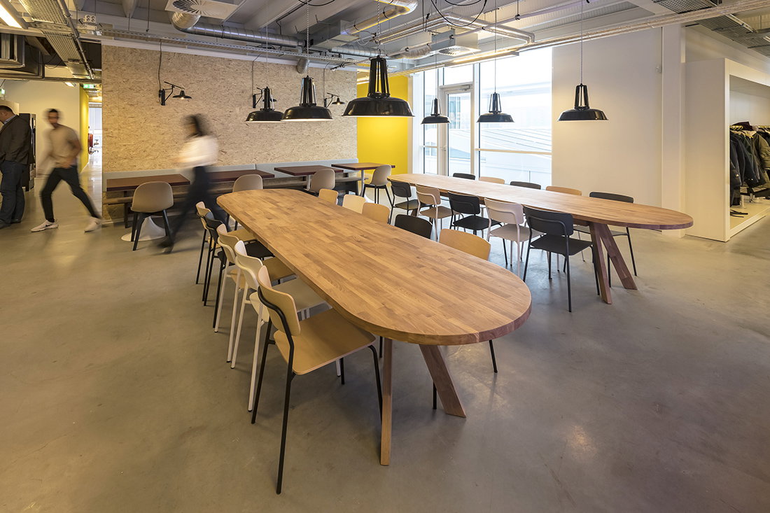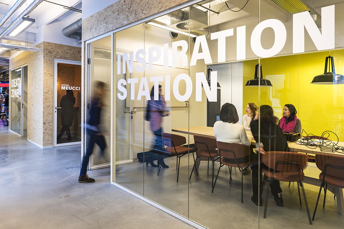 De grote overlegruimtes, kleine concentratiecellen en informele vergadernisjes zijn daarom in ogenschijnlijk ‘losse’ dozen geplaatst welke uitgevoerd zijn in OSB plaatmateriaal voorzien van het