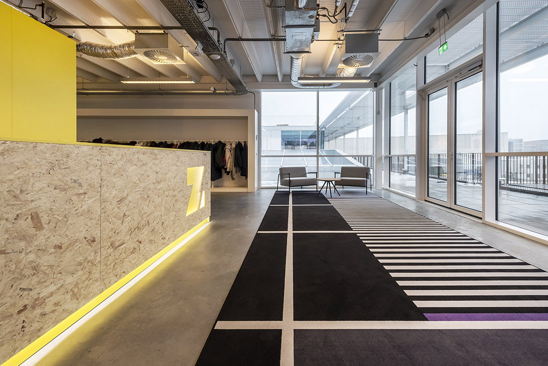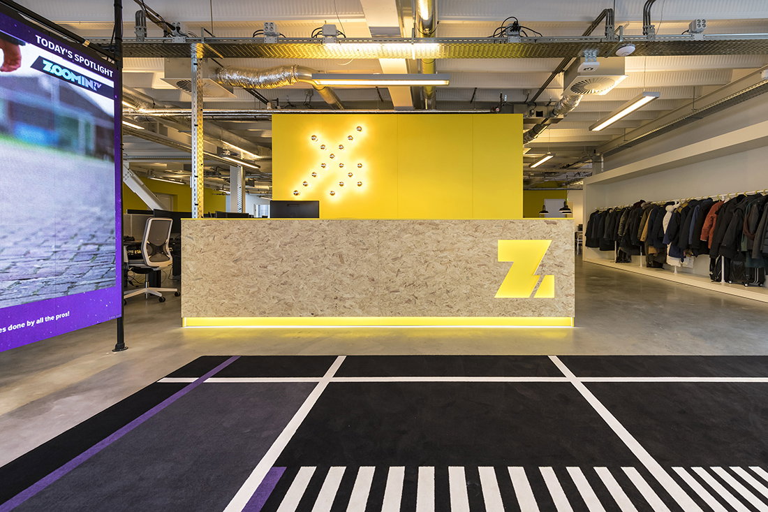 Het interieur is gebaseerd op het kleurenspel vanuit de architectuur van het gebouw, en aangevuld met een frisse nieuwe look en een gedurfd lijnenpatroon in de ‘custom made’ carpetten gebaseerd op het bekende televisie testbeeld, als subtiele verwijzing naar het medium waarin Zoomin.TV opereert.